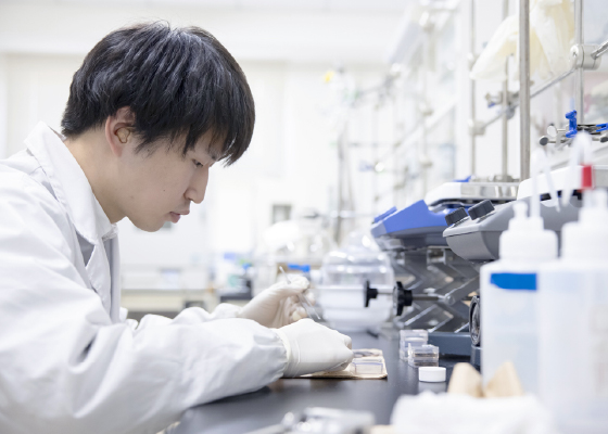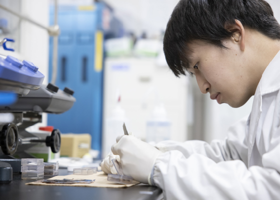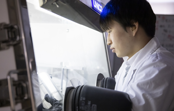 私は生まれつき聴覚に障がいがあるため、補聴器が欠かせません。最近の補聴器には、繰り返し充電が可能なリチウムイオン電池が使われています。テニスに打ち込んでいた高校時代、補聴器が汗で劣化して電池がかぶれを起こし、耳のまわりに炎症を起こす事態に見舞われました。その経験から「電池の安全性を高めることはできないか」と思うようになりました。また、皆さんもご存じのようにリチウムイオン電池は、携帯電話や電気自動車など、私たちの身の回りで数多く使われています。しかし、電池の寿命が尽きた時、安全にゴミ処理ができるかといえば、そうではない状態にあります。そこで私は、耐久性があり、廃棄する時にも安全なリチウム電池の研究を進めています。