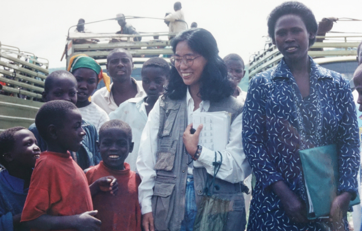 1997年3月、UNHCRの職員として勤務していた頃の清水先生。場所はウガンダで、ルワンダの難民が帰還するためにトラックに乗り組むところを名簿で確認している様子を撮影した写真です。清水先生の右隣の人物は、ウガンダの職員の方。ルワンダの難民の子どもたちに笑顔が見られるのが、とても印象的です。