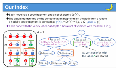 舩本さんが学会で「グラフコードを用いた索引による部分グラフ検索の高速化」について発表した際に使用したスライドより。これまでになかった部分グラフ検索の手法を開発・提案し、いくつかのベンチマークデータセットにおいて、その時点での世界最速の部分グラフ検索手法と比べ、著しく高速に動作することを実証できました。