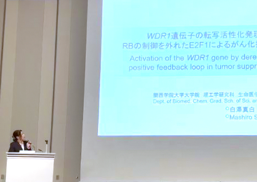 放射線や抗がん剤による現在のがん治療法は、がん細胞だけでなく正常な細胞も傷つけてしまうため、その副作用で多くの患者さんが苦しまれています。この問題の解決に向け、私たちの研究室ではがん発症メカニズムの研究を進め、そのなかで「細胞増殖を制御しているE2Fという因子が、がん細胞においてのみ特異的にがん抑制遺伝子を活性化する」ことを見出しました。これを利用して、がん細胞と正常な細胞を見分け、がん細胞だけを攻撃する「副作用のない治療法」の確立に繋げる、というのが、私たちがめざすゴールです。私自身は「WDR1という因子ががん化を抑制するはたらきをしているのでは?」という点に着目し、独自の研究を推進。学会発表でも多くの反響をいただき、確かな手応えを感じています。