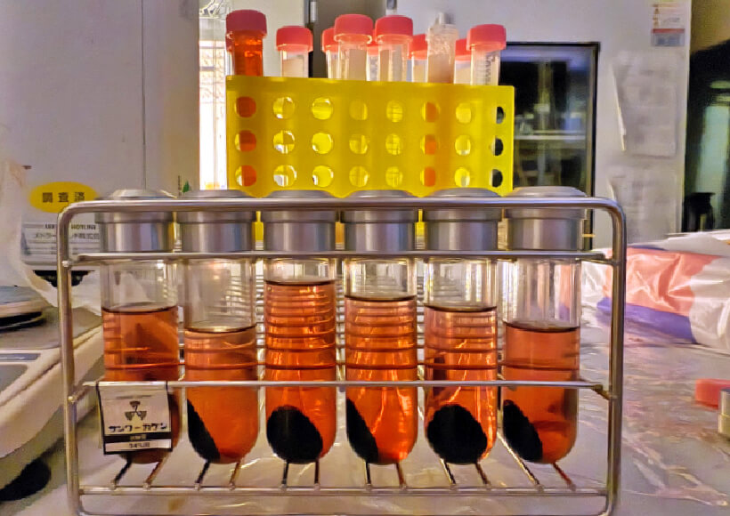 最初は透明に近かった培養液が、細菌が育つとともに緑や赤などの色にだんだんと深まっていくのを、陶さんは面白く感じています。「一方で、目に見えないミクロな世界の現象を“見える化”できるのも研究の魅力。ごくわずかな信号を捉えられた瞬間は、一つのツールを通して別の世界に入り、分子と対話している感覚になれます」。