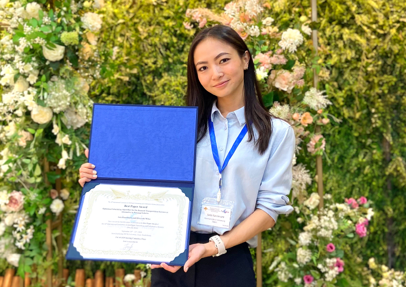大学院の研究室で、最適化アルゴリズムの研究に取り組んでいます。さまざまな現実の課題を対象としていますが、その一つに大阪府豊中市の実証事業への協力のなかで行った、新しいモビリティサービスの提案とその実現のための基盤技術の研究を行っています。少子高齢化と労働力不足が深刻化している地域の新たなモビリティサービスとして、相互扶助で運用するオンデマンドバスと地域防犯パトロールを組み合わせたシステムを提案すると同時に、このサービスの実現可能性を左右する、走行ルートなどのスケジュールを決定するアルゴリズムを設計し、実データに基づいて有効性を評価しました。さらにこの研究成果から論文を執筆し、国際会議『INCoS-2024』で発表し、『Best Paper Award』を受賞しました。